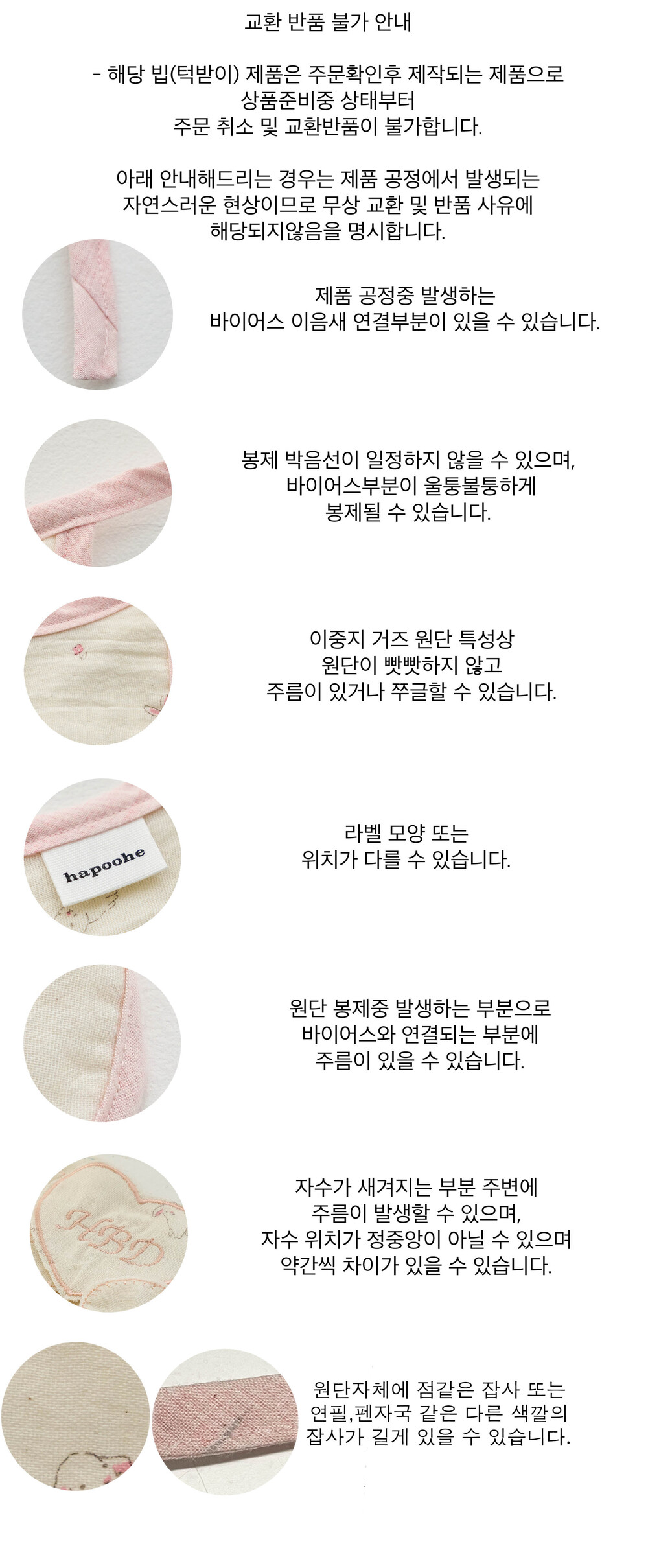 핸드메이드 제품으로 크기나 박음질이 일정하지 않을수 있으며 이에관한 교환및 반품은 불가합니다.