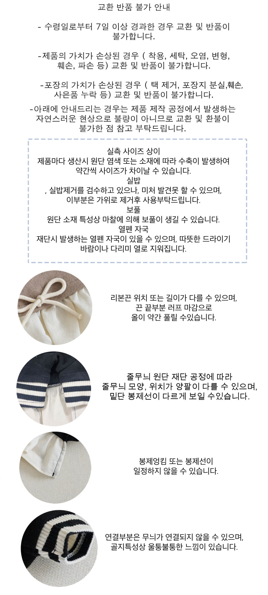 제품 원단 특성상 잡실이 섞여 있을 수 있으며 이부분은 무상환불 사유가 아닙니다.